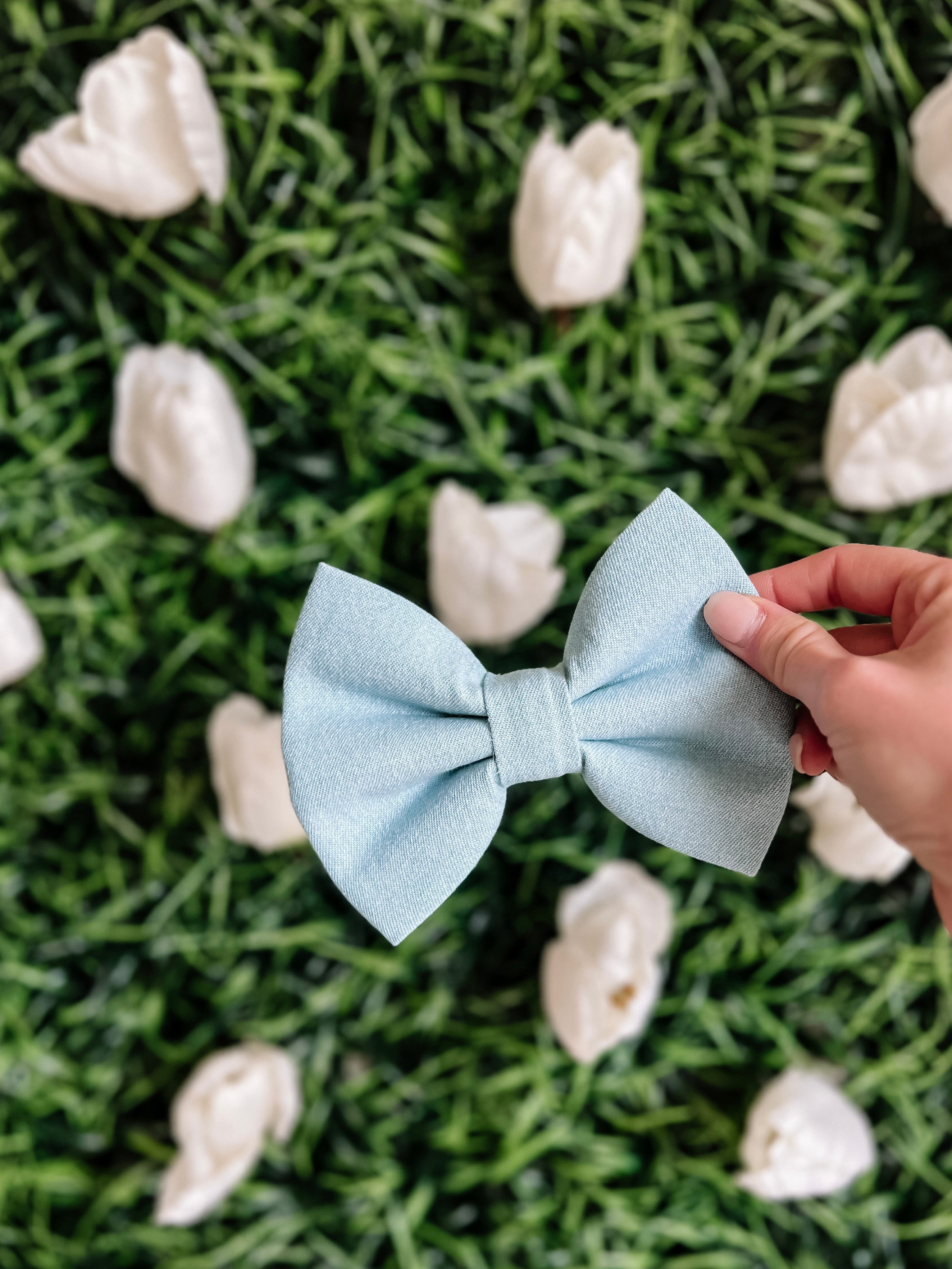 Our small-sized bow + bow tie is perfect for small dogs and cats! We recommend spot cleaning or hand washing your bow and/or bow tie.